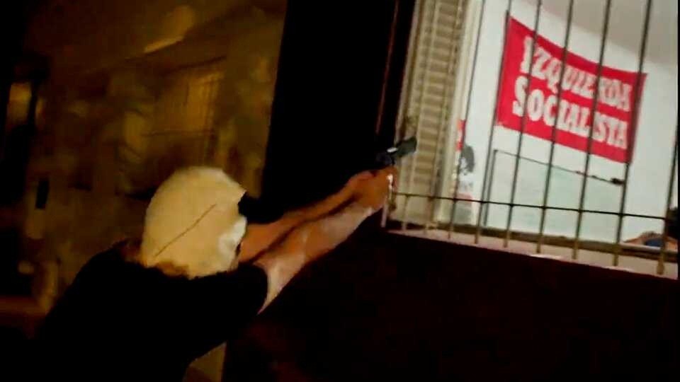 Dos individuos del Centro Cultural Kyle Rittenhouse de ideología abiertamente neonazi e identificados con la Libertad Avanza, espacio liderado por Javier Milei, se acercan a la ventana del local y apuntan con un arma de fuego mientras en su interior se está realizando una actividad partidaria del Partido Izquierda Socialista