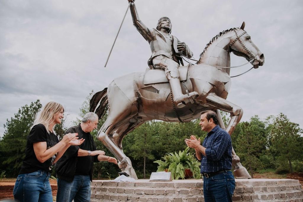 (Misiones-Almafuerte, 05.Abr.2023 / A1 Noticias) El Gobernador Oscar Herrera Ahuad descubrió una estatua levantada en homenaje al héroe y símbolo misionero Andrés Guacurarí. El monumento “Andresito a Caballo” es obra del artista Gerónimo Rodríguez trabajada con chatarra reciclada y financiada con fondos municipales. Luego, junto a la intendenta Celia Smiak, recorrió el nuevo acceso asfaltado que conecta a la Ruta Provincial N.º 4 con la zona urbana del municipio. La conexión garantiza el tránsito ágil y seguro de vehículos en forma permanente y es una vía de circulación para la producción local.