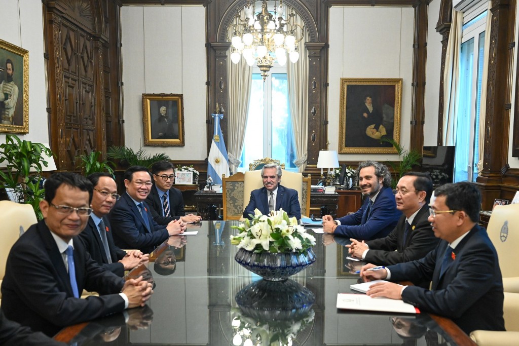 (CABA, 24.Abr.2023 / A1 Noticias) Acompañado por el ministro de Relaciones Exteriores, Comercio Internacional y Culto, Santiago Cafiero, el mandatario argentino y el titular de la Asamblea Nacional vietnamita destacaron la oportunidad que existe para avanzar en la asociación estratégica en el sector agroindustrial, así como para profundizar la cooperación en diversas áreas de interés mutuo como el comercio, inversiones, asuntos espaciales y ciencia y tecnología.
