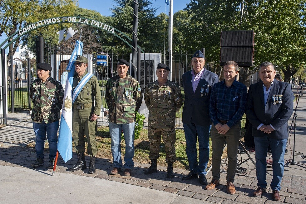 Frente al monumento a los Veteranos de Malvinas, el intendente Sebastián Abella, el sobreviviente Ricardo Córdova y ex combatientes de la Guerra de Malvinas estuvieron al frente del homenaje en el que se recordaron a los 323 caídos en el hundimiento del buque de guerra.