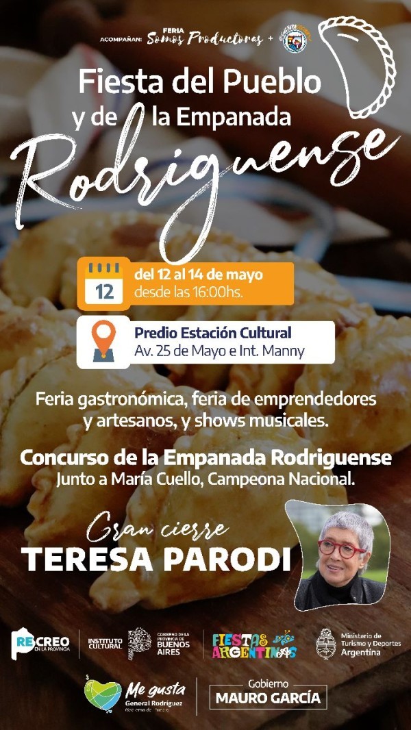 Entre el viernes 12 y el domingo 14 de mayo se realizará en el Predio de la Estación Cultural, ubicado en Av. 25 de Mayo e Intendente Manny, la Fiesta del Pueblo y de la Empanada Rodriguense, junto a María Cuello, Campeona Nacional.