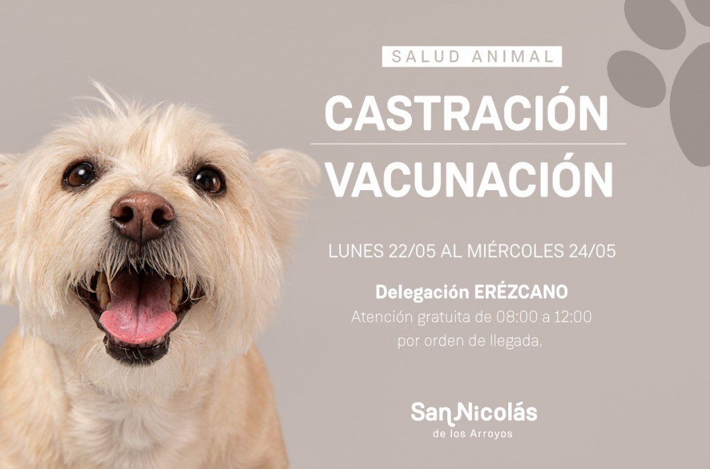 Desde el lunes 22 y hasta el miércoles 24 de mayo de 8:00 a 12:00, el tráiler de castración y vacunación de la Municipalidad de San Nicolás estará ubicado en la Delegación de Erézcano