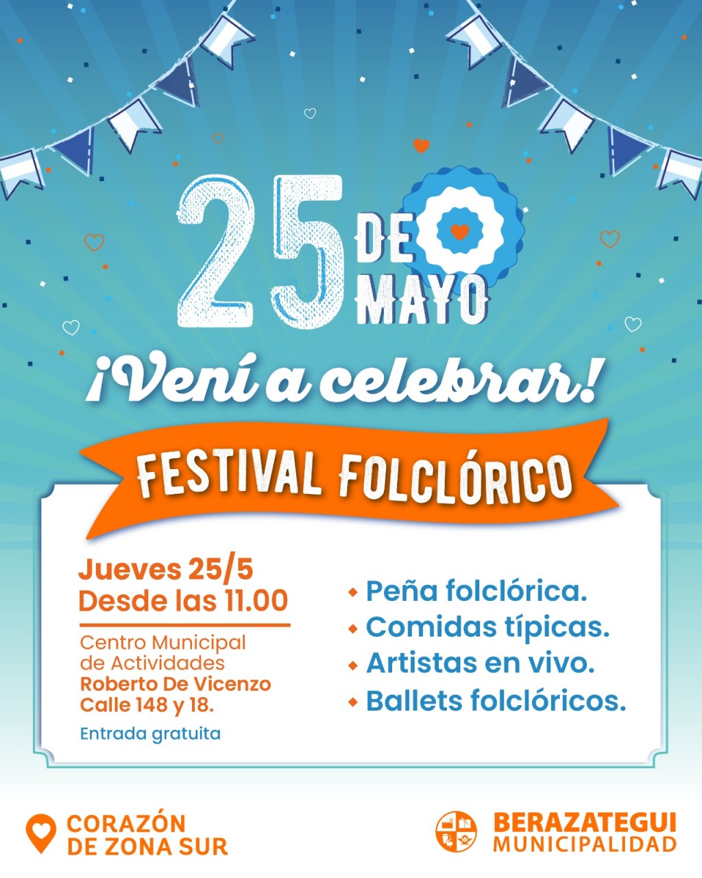 (Berazategui, 24.May.2023 / A1 Noticias) Ernesto Ponce, director de Logística de la Secretaría de Cultura y Educación de la Municipalidad, señaló al respecto: “Estamos palpitando y ultimando detalles para el gran festejo del 25 de Mayo. Invitamos a los vecinos y las vecinas a disfrutar de una gran jornada folclórica con música y comidas típicas”.