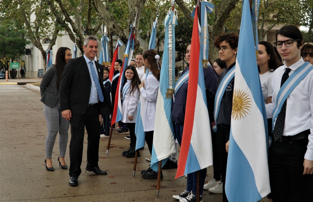 El Intendente de Colón José Luis Walser junto al viceintendente Ramiro Favre y alumnos de ADCADIS y de la Escuela Paso, depositaron una ofrenda floral en el busto que recuerda a Manuel Belgrano, en la Plaza Washington.