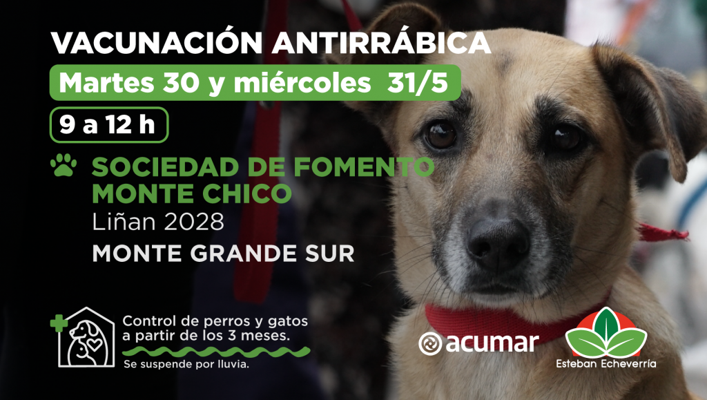 Los días martes 30 y miércoles 31 de mayo, de 9 a 12 horas, los equipos de trabajo del Municipio de Esteban Echeverría y de la Autoridad de Cuenca Matanza Riachuelo (ACUMAR) realizarán un nuevo operativo de control veterinario en la Sociedad de Fomento Monte Chico (Liñan 2028, Monte Grande Sur)
