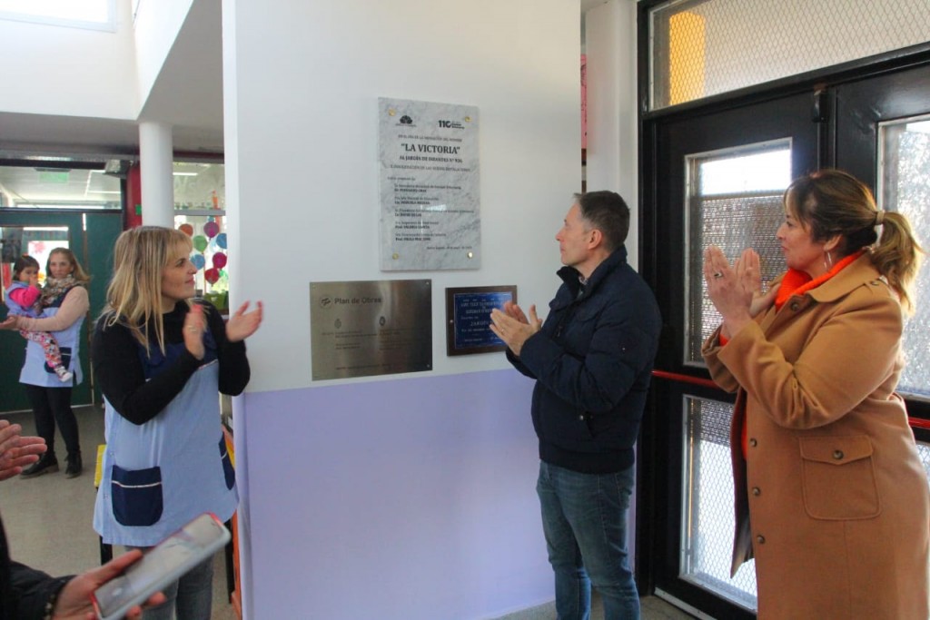 El jefe comunal inició la tarde en el Jardín de Infantes N° 936 de Atención Temprana del Desarrollo Infantil (ATDI), donde inauguró un aula de 40 m² equipada con mobiliario escolar y un baño integrado, un sector de juegos y la ampliación y renovación de la cocina. Además, participó de la ceremonia de imposición de nombre de la institución educativa, que pasó a llamarse "La Victoria", y conversó con el equipo docente, al que otorgó un subsidio destinado a la adquisición de materiales de pintura y juegos para el parque del jardín.