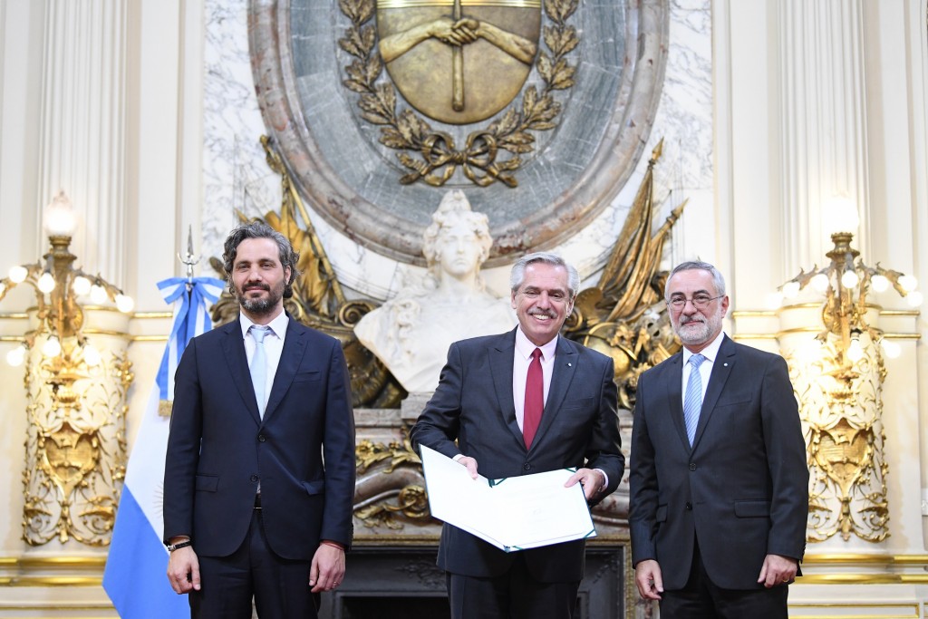 El mandatario nacional, Alberto Fernández encabezó la ceremonia de recepción de las cartas credenciales de 25 nuevos embajadores y embajadoras junto al ministro de Relaciones Exteriores, Comercio Internacional y Culto, Santiago Cafiero, en el Salón Blanco de Casa Rosada
