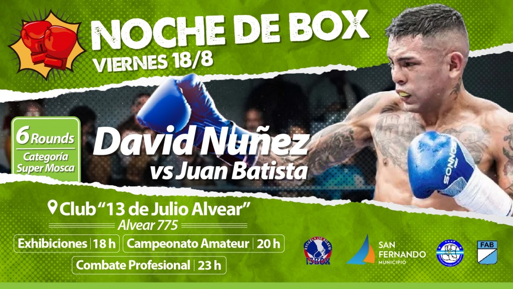 (San Fernando, 18.Ago.2023 / A1 Noticias) San Fernando invita a vecinos a acompañar al púgil David “El Escorpión” Núñez que enfrentará a Juan Batista en la categoría Super Mosca en el “Club 13 de Julio Canal” en Alvear 775. La pelea central a 6 rounds, comenzará a partir de las 23h