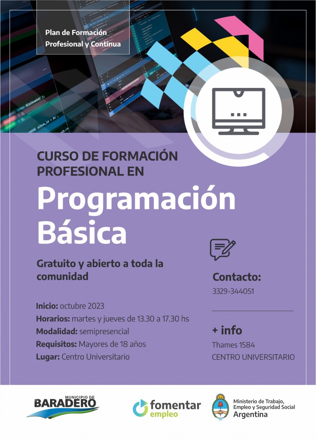 Inicia en octubre de 2023. Los días y horarios de cursada son los lunes y miércoles de 14 a 16 horas, y los viernes de 14 a 18 horas. La modalidad es semipresencial. Dirigido a personas mayores de 18 años. Se dictará en el Centro Universitario Baradero (Thames 1584).