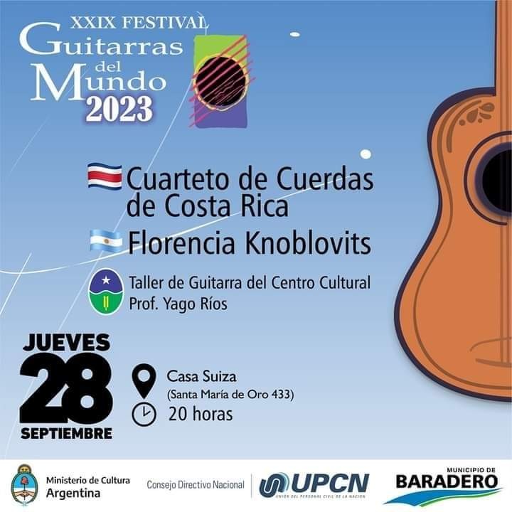 (Baradero, 26.Sep.2023 / A1 Noticias) En el evento, se presentará el Taller de Guitarra del Centro Cultural municipal a cargo del Prof. Yago Ríos en representación a nuestra ciudad. También actuará Florencia Knoblovits que será la actuación nacional y el Cuarteto de Cuerdas de Costa Rica, que será la presentación internacional.