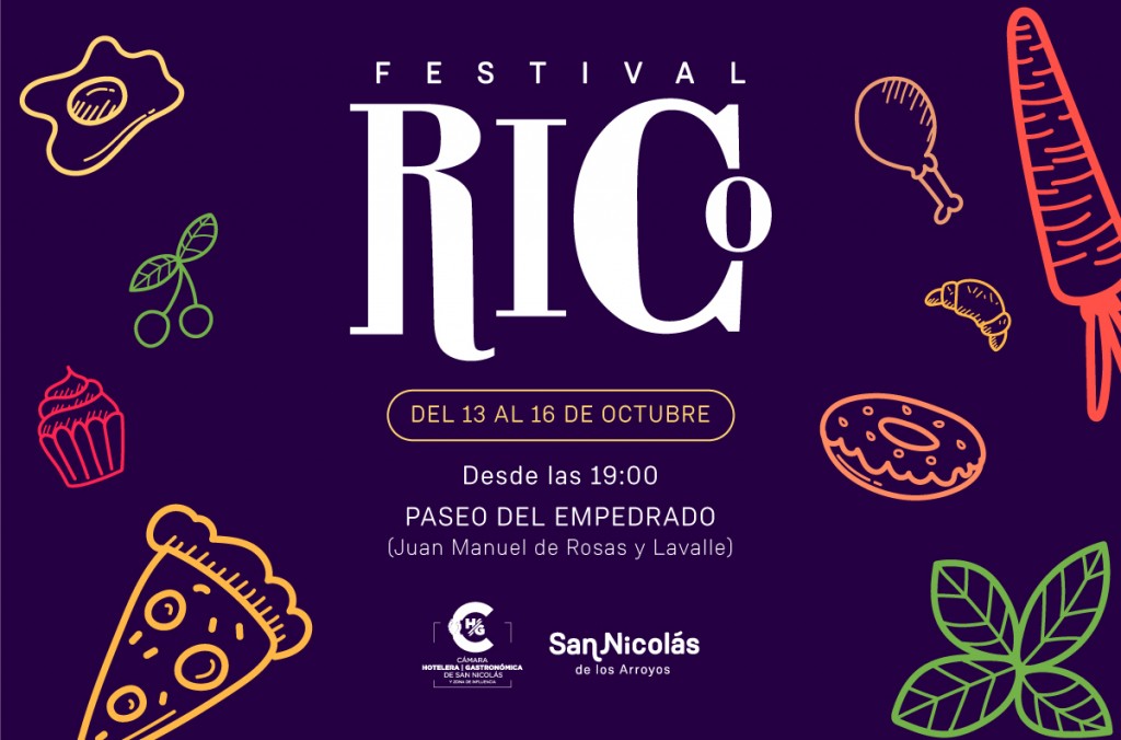(San Nicolás, 03.Oct.2023 / A1 Noticias)  RICO se desarrollará desde el 13 al 16 de octubre a partir de las 19:00 y contará con 14 restaurantes, 9 mercados con productos de pastelería, 12 barras de tragos y 8 foodtrucks. Además, muchos artistas locales y nacionales pasarán por el escenario de este Festival que ya es un clásico de la región.