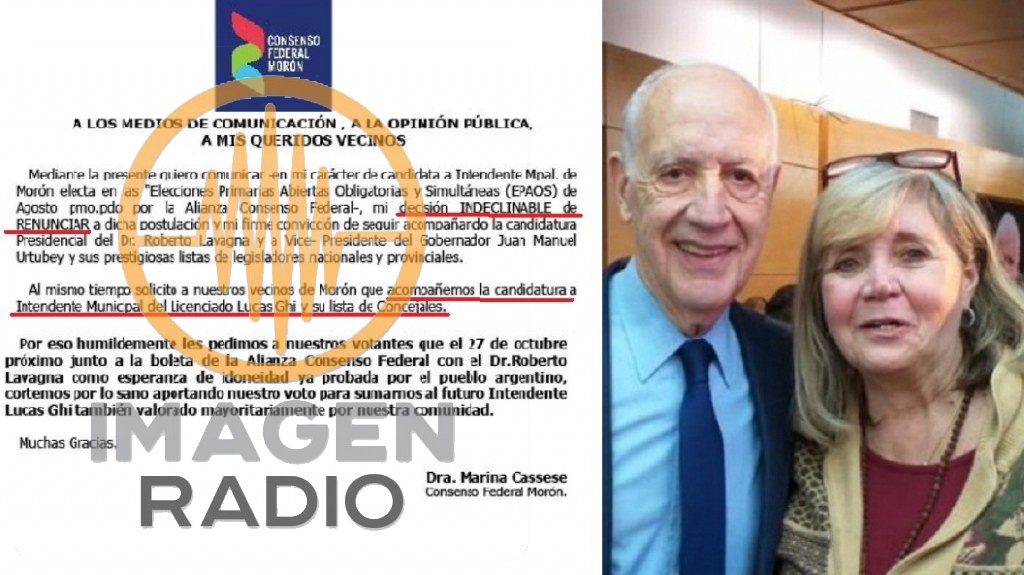 La candidata de Consenso Federal, Marina Cassese quien triunfó en la PASO del espacio, se bajó de la candidatura a la intendencia firmando un comunicado. A una semana de la elección general reiteró que su renuncia es indeclinable y pidió votar por el ex intendente Lucas Ghi, asegurando que “es quien mejor interpreta a un Morón eficiente y justo”