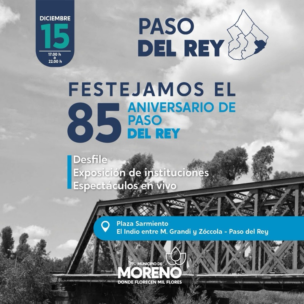 El Municipio celebrará el Aniversario N° 85 de la localidad de Paso del Rey, el 15 de diciembre, a partir de las 17 horas, en la plaza Sarmiento, ubicada en la calle El Indio entre M. Grandi y Zoccola