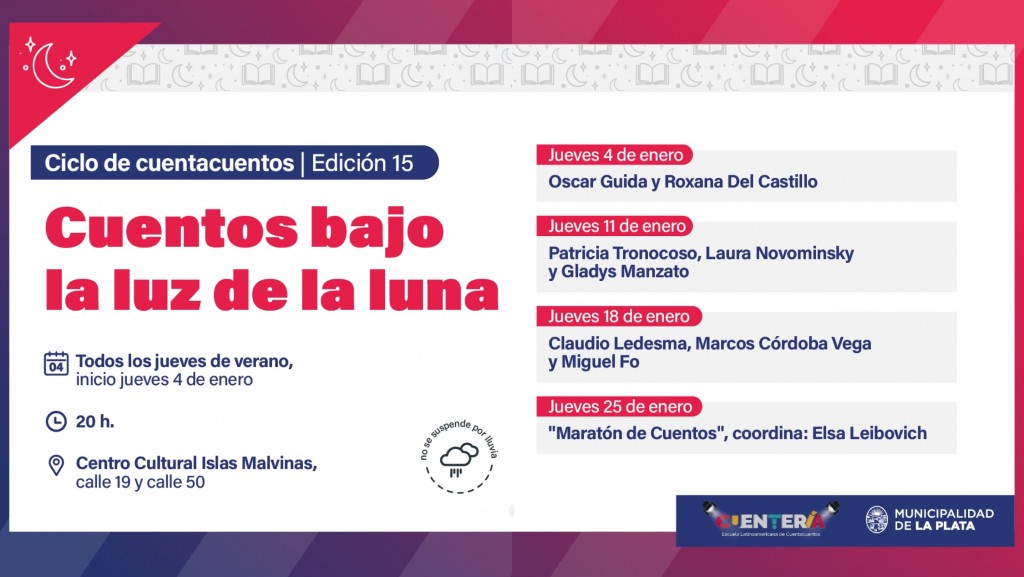 La Municipalidad invita a disfrutar de “Cuentos bajo la luz de la luna”, el exitoso ciclo de relatos literarios en horario nocturno y de manera gratuita que celebra sus 15 años con una nueva propuesta que se desarrollará todos los jueves de enero, febrero y marzo a las 20 horas en el Centro Cultural Islas Malvinas