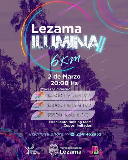 ¡El desafío continúa! Ya están disponibles los valores de inscripción para la esperada segunda edición de Lezama Ilumina. EL próximo sábado 2 de marzo, a partir de las 20:00 horas, anímate a ir por más y viví la emoción de la carrera de 6KM por las calles de nuestra ciudad