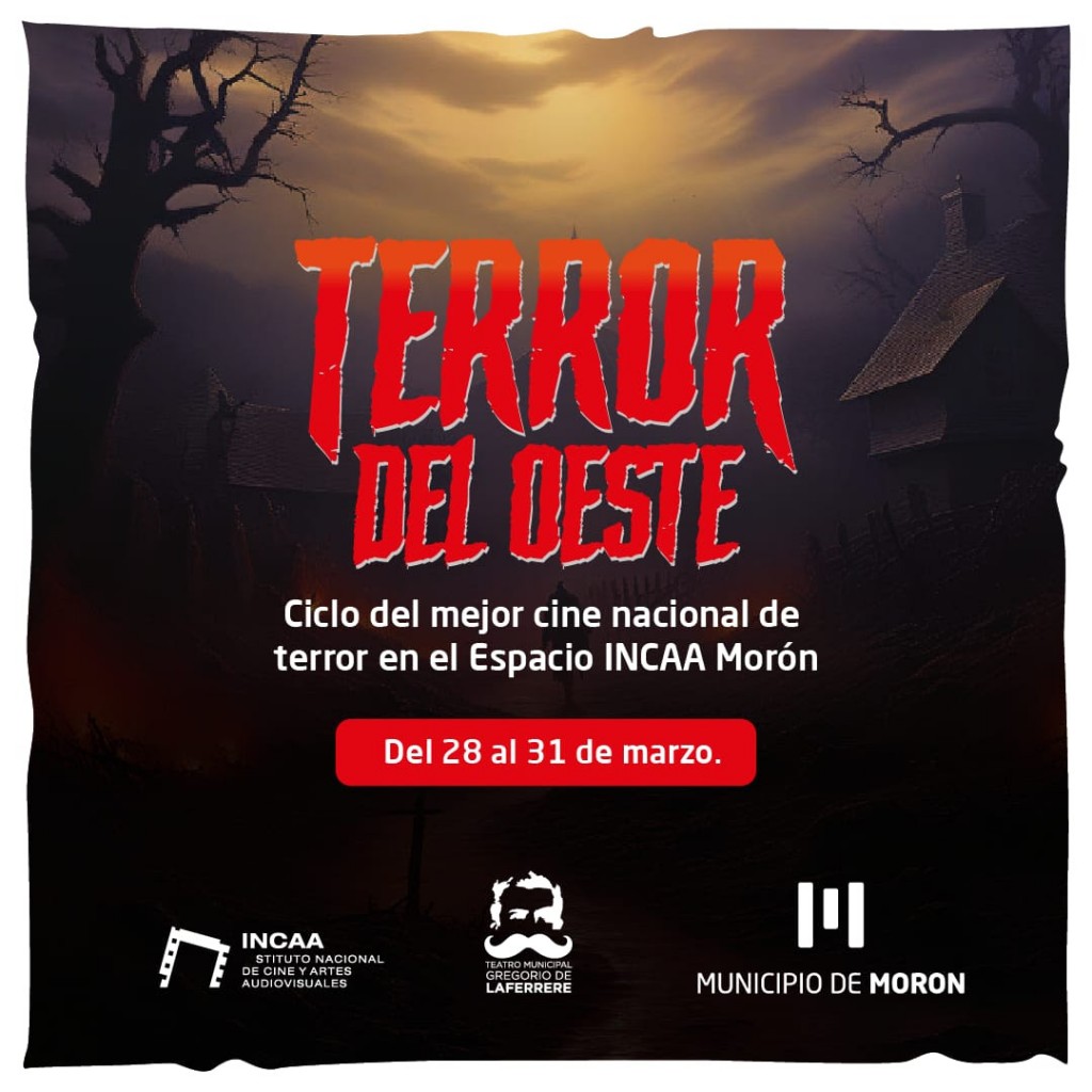 (Morón, 27.Mar.2024 / A1 Noticias) El Municipio realizará el ciclo “Terror del Oeste” del 28 al 31 de marzo en el Espacio INCAA del Teatro Municipal Gregorio de Laferrere (Brown y San Martín, Morón). Se proyectarán las últimas producciones nacionales del género de terror y fantástico, entre las que se destacan las películas “Cuando acecha la maldad” y “Pussy Cake” de los directores, oriundos de zona oeste, Demián Rugna y Pablo Parés.