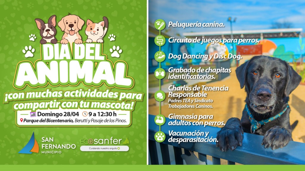(San Fernando, 24.Abr.2024 / A1 Noticias) La Secretaría de Desarrollo Social, Educación y Medio Ambiente de San Fernando organizó un evento especial con actividades por el Día del Animal el próximo domingo 28 de abril de 9 a 12.30h en el Parque del Bicentenario de Berutti y Los Pinos, con entrada libre y gratuita.