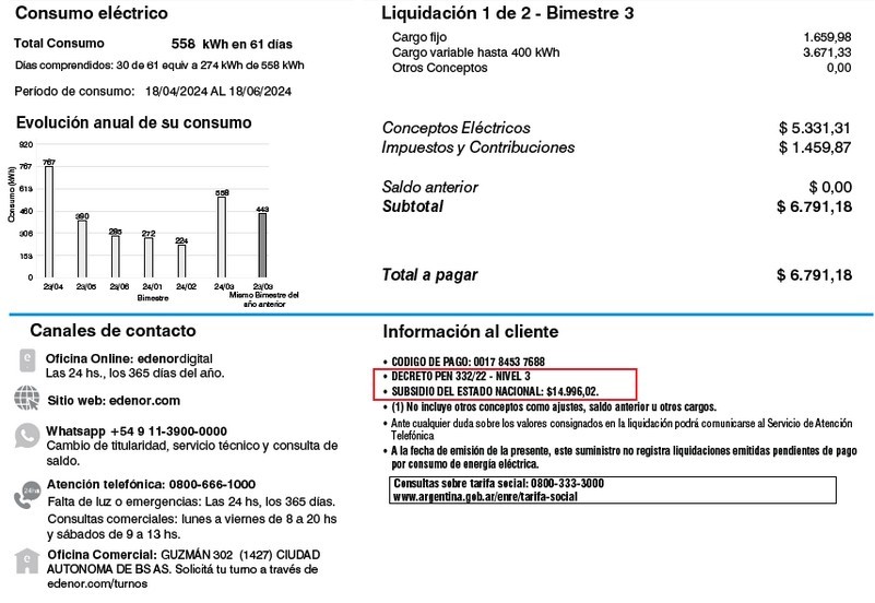 (CABA, 16.Jul.2024 / A1 Noticias) En el marco del Decreto Nº 465/2024 que determinó la reestructuración del esquema de subsidios al consumo energético y estableció un período de transición de un régimen general a otro focalizado, el ENRE recomienda a los usuarios residenciales del servicio eléctrico verificar en sus facturas el nivel de subsidio asignado, que se aplica para calcular la liquidación mensual correspondiente.