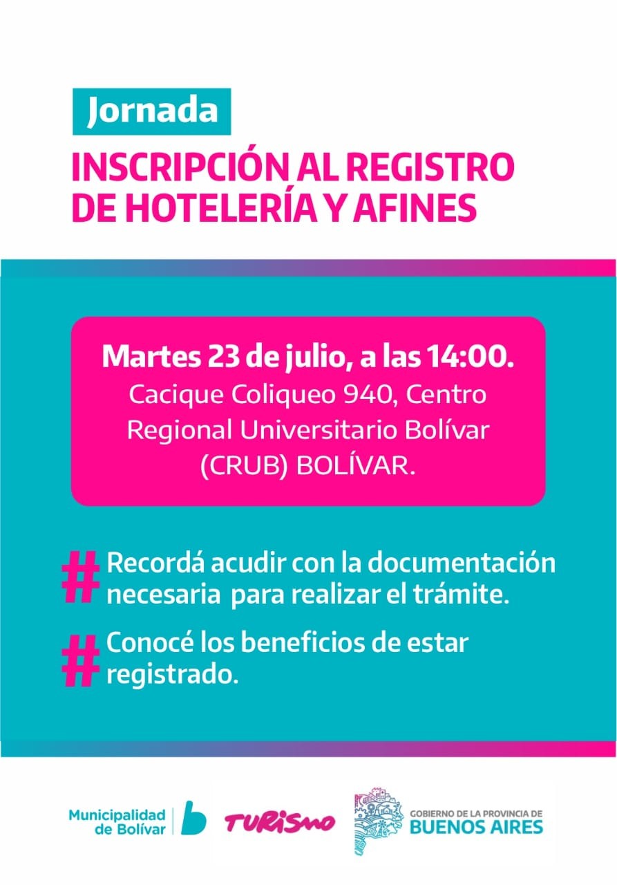 La Dirección de Turismo realizará una jornada de Inscripción al Registro de Hotelería y Afines, este martes 23 a las 14hs en el Centro Regional Universitario Bolívar, con el objetivo de acompañar a los prestadores turísticos locales