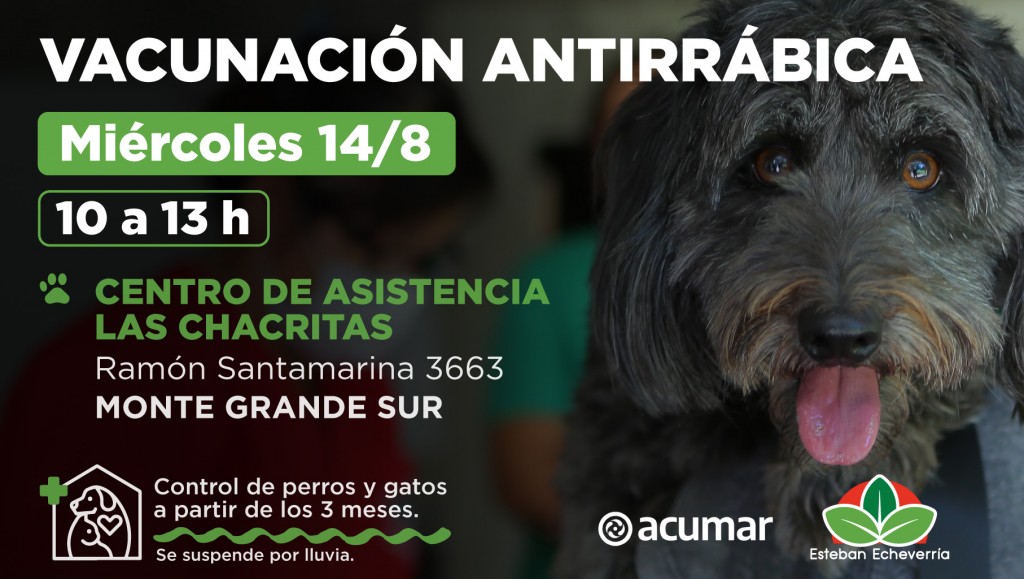 El miércoles 14 de agosto, de 10 a 13 horas, los equipos de trabajo del Municipio de Esteban Echeverría y de la Autoridad de Cuenca Matanza Riachuelo (ACUMAR) realizarán una nueva jornada de vacunación antirrábica para perros y gatos a partir de los tres meses. Se llevará a cabo en el Centro de Asistencia Las Chacritas (R. Santamarina 3663, Monte Grande Sur)