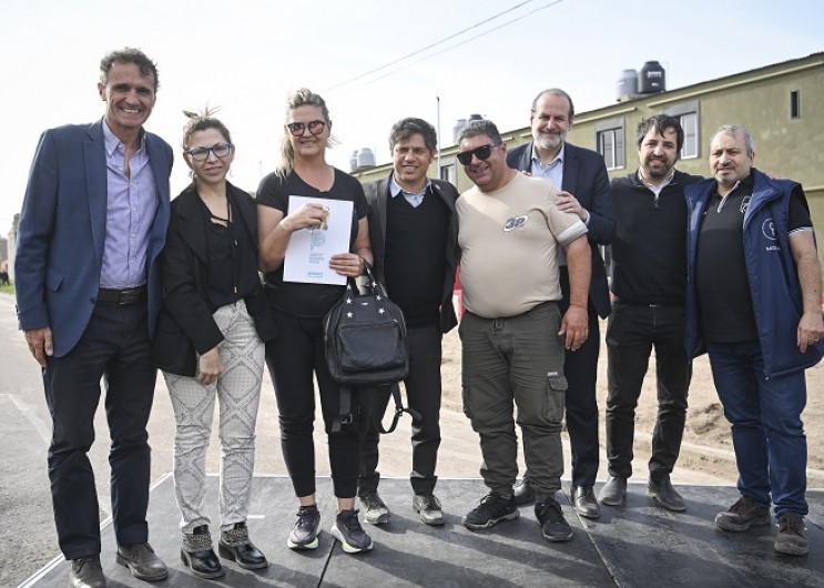 El gobernador de la provincia de Buenos Aires, Axel Kicillof, encabezó el acto de entrega de 18 viviendas en Bahía Blanca, junto a la ministra de Hábitat y Desarrollo Urbano, Silvina Batakis; el intendente local, Federico Susbielles; y el secretario general del Sindicato Único de Trabajadores de la Industria de Aguas, Gaseosas y Afines (SUTIAGA), Marcelo Colombo