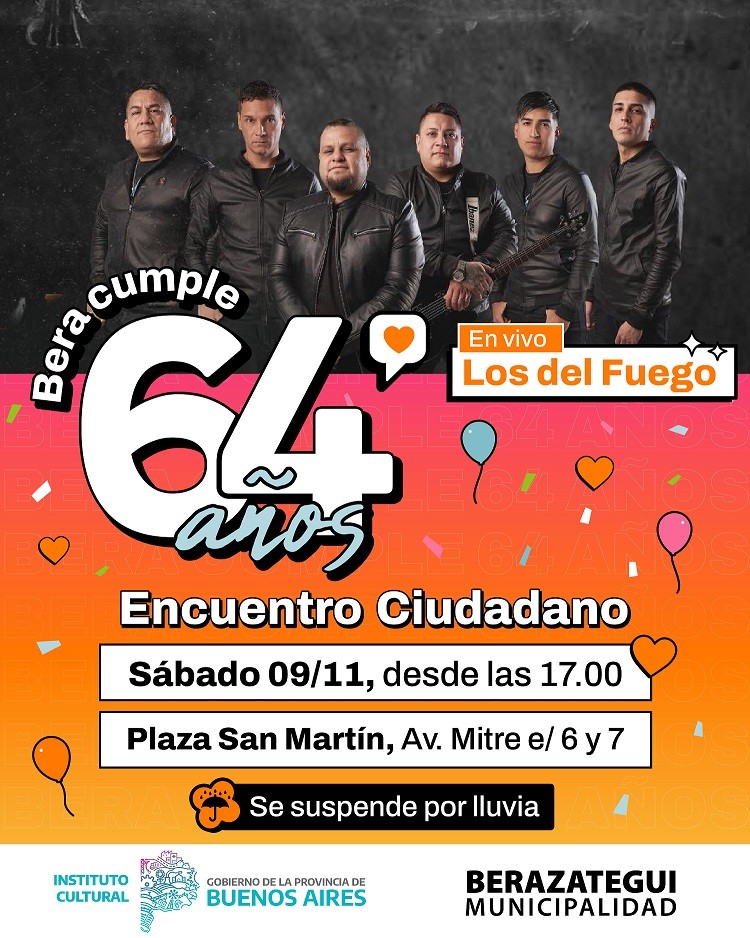En el marco del 33° Encuentro Ciudadano por la Autonomía, Berazategui festejará su 64° aniversario. Será este sábado 9 de noviembre, a partir de las 17.00, en la Plaza San Martín (Av. Mitre e/ 6 y 7), con el show en vivo de Los del Fuego -la mítica banda de cumbia santafesina- para celebrar a todo ritmo. El evento, de acceso libre y gratuito, se suspenderá en caso de lluvia