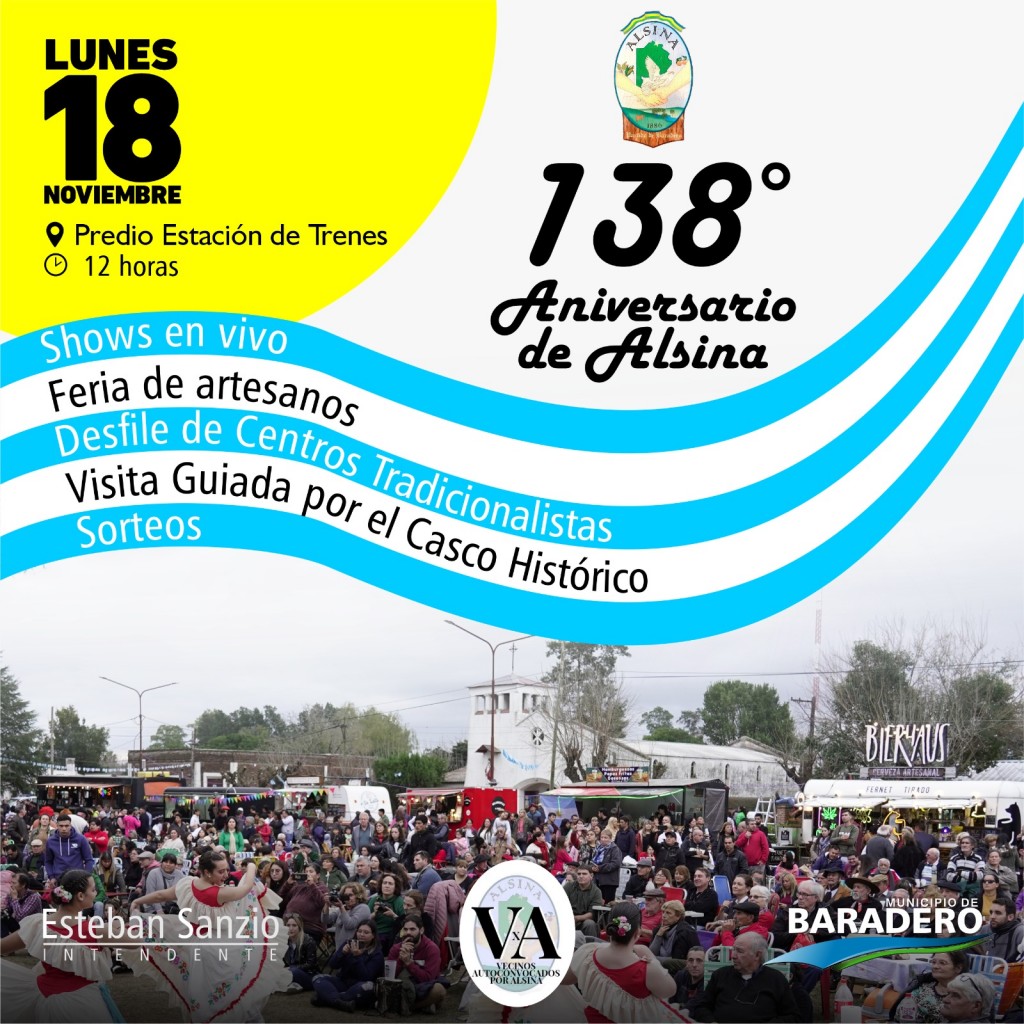 El Municipio invita a los festejos por el 138 aniversario de la localidad de Alsina que tendrán lugar el próximo lunes 18 a partir de las 12 horas, en el predio de la Estación de Trenes