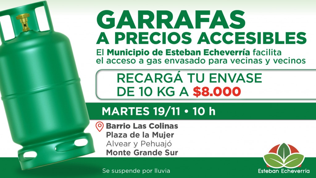La Municipalidad continúa con los operativos para que las vecinas y los vecinos del distrito puedan recargar sus garrafas a un precio social. El martes 19 de noviembre, a las 10 horas, se desarrollará en la Plaza de la Mujer (Alvear y Pehuajó, Barrio Las Colinas, Monte Grande Sur)