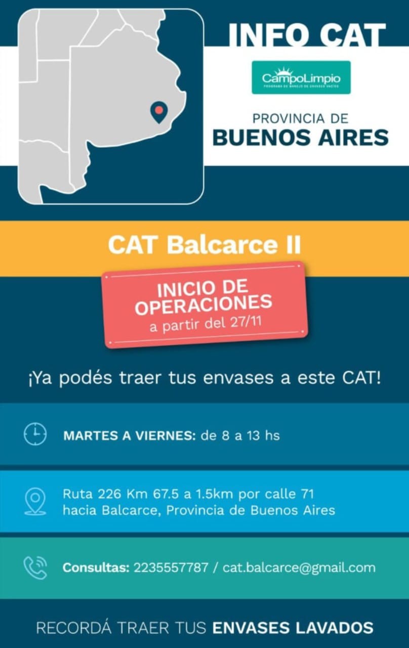 (Balcarce, 28.Nov.2024 / A1 Noticias) El CAT Balcarce II está ubicado en ruta nacional 226 Km 67.5, ingresando por calle 71 hacia Balcarce, y estará disponible para que productores, distribuidores y aplicadores puedan llevar sus envases vacíos de manera adecuada.
