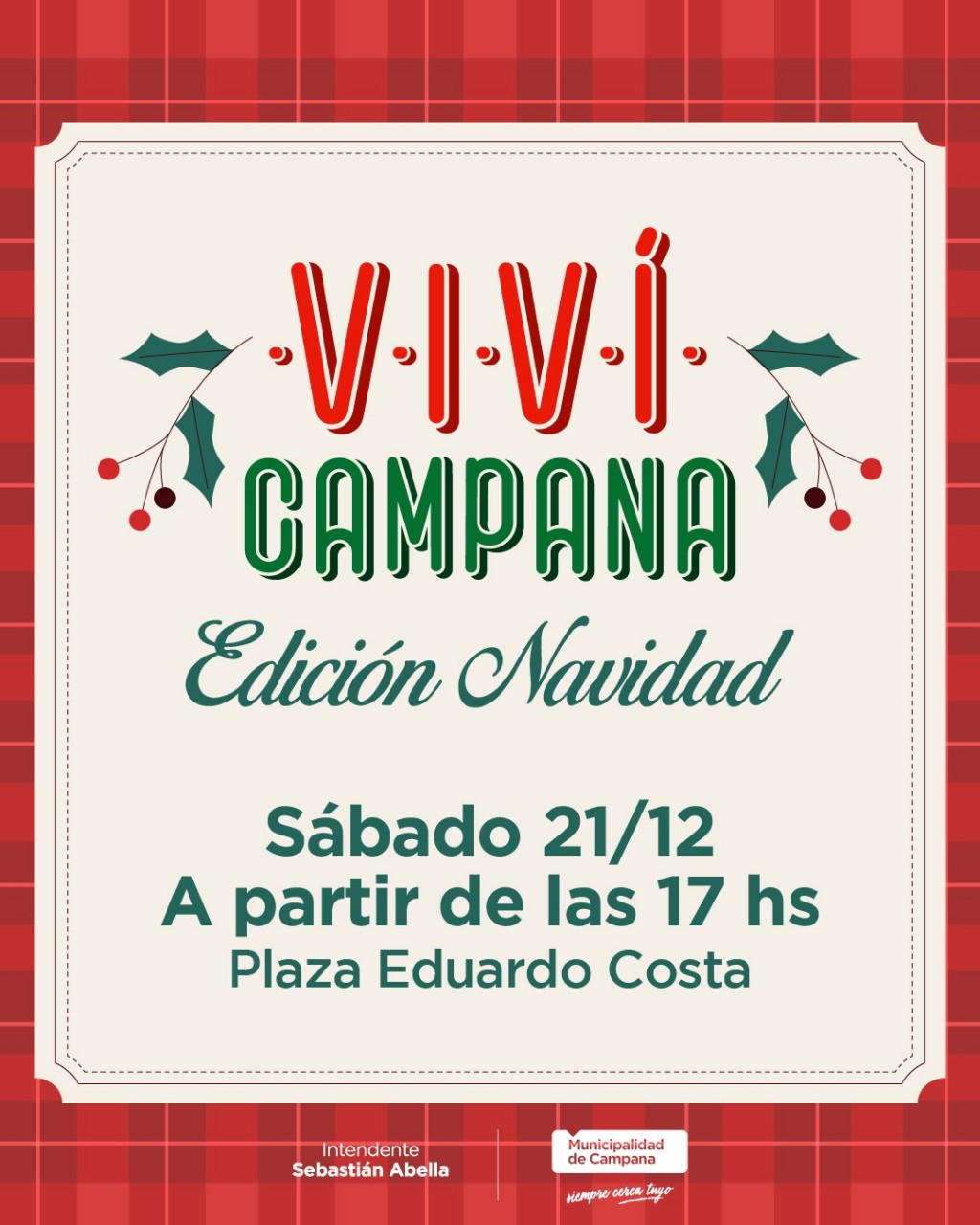 (Campana, 17.Dic.2024 / A1 Noticias) De cara a la fecha más festiva del año, el Municipio realizará este sábado 22, desde las 17, una nueva edición de “Viví Campana – Edición Navidad” en la plaza Eduardo Costa.