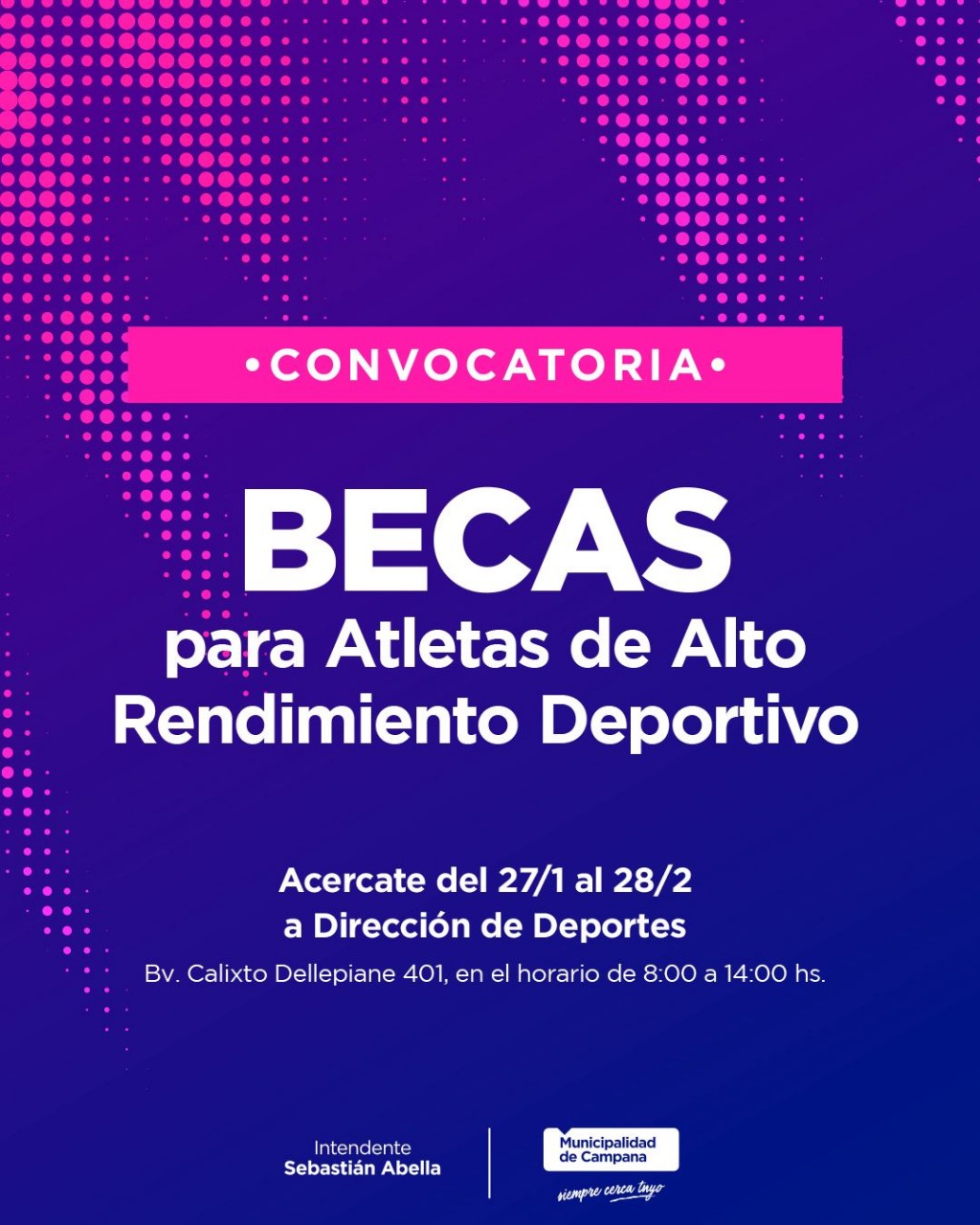 (Campana, 27.Ene.2025 / A1 Noticias) El Municipio, a través de la Secretaría de Inclusión, Educación y Cultura, lanza una nueva convocatoria a las Becas para Atletas de Alto Rendimiento Deportivo.