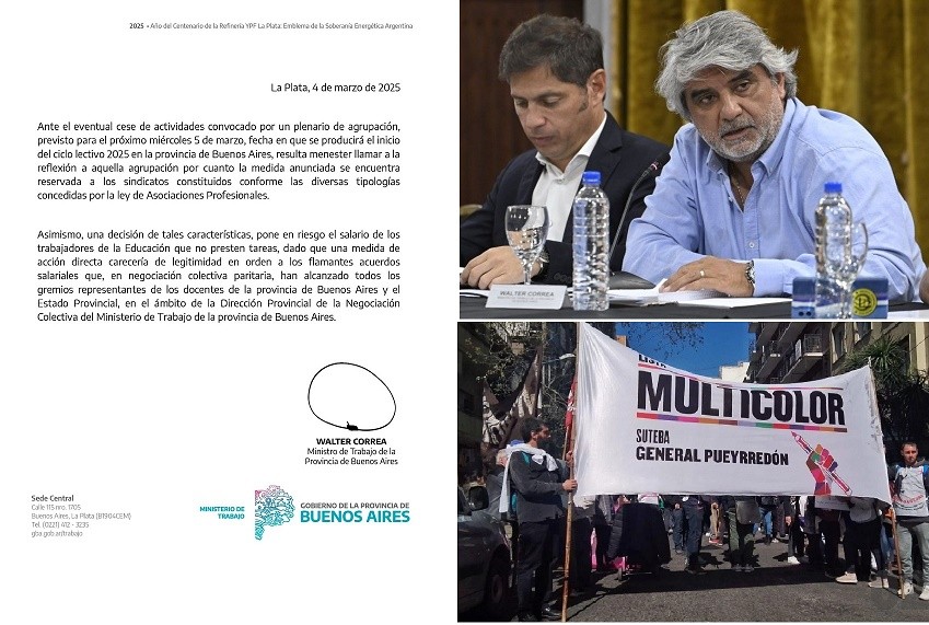 El mensaje que lleva la firma del Ministro de Trabajo, Walter Correa, subraya que “ante el eventual cese de actividades convocado por un plenario de agrupación, previsto para el próximo miércoles 5 de marzo, fecha en que se producirá el inicio del ciclo lectivo 2025 en la provincia de Buenos Aires, resulta menester llamar a la reflexión a aquella agrupación por cuanto la medida anunciada se encuentra reservada a los sindicatos constituidos conforme las diversas tipologías concedidas por la Ley de Asociaciones Profesionales”, recordando que no poseen personería jurídica para la convocatoria.