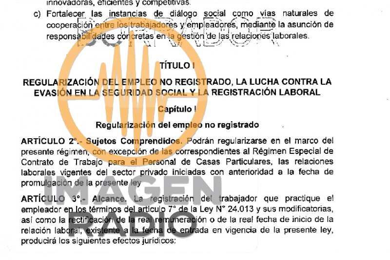 (Informe Especial de A1 Noticias) Se plantea una condonación de todas las deudas por capital, intereses, multas y punitorios correspondientes a la seguridad social. Los trabajadores que sean regularizados tendrán derecho a computar hasta 60 meses de servicios con aportes calculados sobre un monto mensual equivalente al salario mínimo, vital y móvil. El plazo para las regularizaciones será de un año a partir de la sanción de la ley.