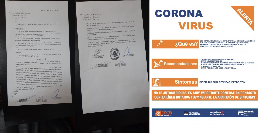 El intendente de La Matanza, declaró la Emergencia Sanitaria en todo el distrito por 180 días a partir del viernes 13 de marzo. Además decretó una medida especial creando el Consejo para la Emergencia Sanitaria Municipal, de carácter interinstitucional e interdisciplinario y autoriza por decreto a afectar partidas presupuestarias para atender la emergencia