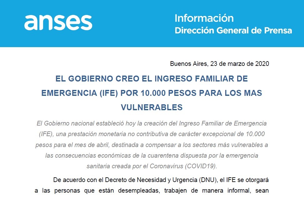 (CABA, 23.Mar.2020 / A1 Noticias) El Ingreso Familiar de Emergencia (IFE) se percibirá durante el mes de Abril y podría repetirse en Mayo si el aislamiento continúa. Se analizará la totalidad del grupo familiar, para definir su asignación.
