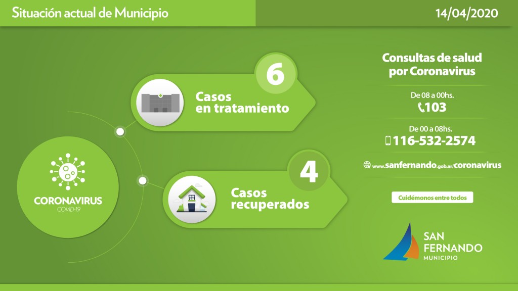 (San Fernando, 14.Abr.2020 / A1 Noticias) La Secretaría de Salud Pública, Desarrollo Humano y Políticas Ambientales de San Fernando comunicó el diagnóstico positivo de Coronavirus COVID-19 en cuatro vecinos de la ciudad desde el último reporte brindado, totalizando 6 casos en tratamiento, y el alta clínica y virológica recibida por otro paciente, el 4to recuperado en el distrito.