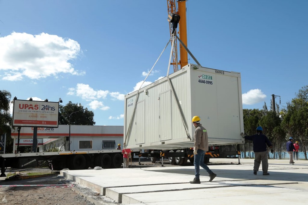 Se completa el montaje de las estructuras modulares del Hospital de Emergencia que se construye en el predio de la Unidad de Pronta Atención (UPA) en Longchamps. Adelantan que desde principios de mayo este nosocomio público funcionará las 24 horas con una planta de 100 trabajadores de la salud