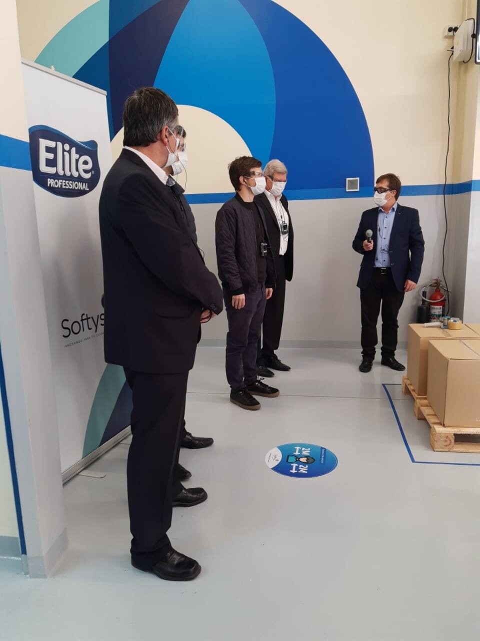La cita se dio en el marco de la inauguración de la nueva línea de producción, para la elaboración de barbijos de tipo quirúrgico de la firma Softys, con la presencia del Ministro de Producción Ciencia e Innovación tecnológica de la provincia de Buenos Aires, Augusto Costa, integrantes de la cartera provincial, y el titular del Concejo Deliberante, Ariel Rios