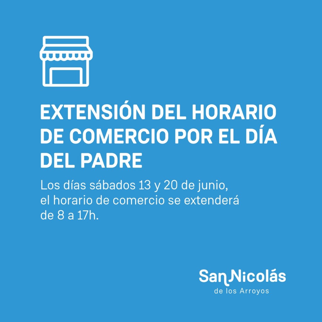 Durante los sábados 13 y 20 de junio, los comercios de la ciudad podrán extender el horario de atención para darle la posibilidad a los nicoleños de realizar las compras del Día del Padre que se celebra el domingo 21 de junio
