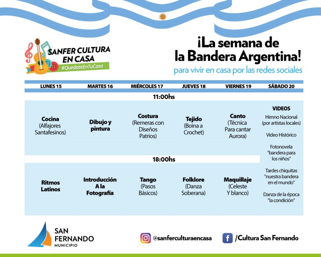 Asimismo, las actividades educativas que se transmitirán desde el lunes 15 hasta el sábado 20 por el Facebook SanferAprendeEnCasa, y el Instagram @sanferaprendeencasa son las siguientes: De lunes a viernes a las 11hs: Armamos banderas celestes y blancas; a las 14hs: Actividades en familia; a las 15hs: Aprendemos la historia de nuestra Bandera. Mientras que el martes 16 de junio, 17hs: Video sobre el Instagram de Manuel Belgrano y el sábado 20 de junio, a partir de las 15 hs, compartimos las banderas que hicimos en la semana.