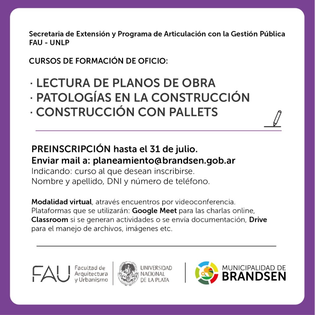 Desde la Dirección de Planeamiento y Catastro Municipal, se informa que se abre la pre-inscripción a Cursos de Formación de Oficios, dictados por docentes la Facultad de Arquitectura y Urbanismo de la UNLP, a través de la Secretaría de Extensión y Programa de Articulación con la Gestión Pública
