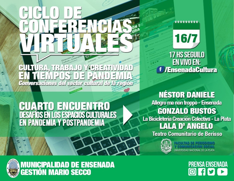 Ensenada: Charla sobre el sector cultural de la región. Jueves a las 17 Desafíos de los espacios culturales en pandemia y pos pandemia". Con la participación de: Néstor Daniele (Allegro Ma Non Troppo - Ensenada), Gonzalo Bustos (La Bicicleteria Creación Colectiva - La Plata) y Lala D'Angelo (Teatro comunitario - Berisso). https://bit.ly/3hghTqz / Música. Versión de "11 y 6" de Fito Páez interpretada por Nico Martínez con Abe González en piano, Martin Fuentes en coros y Fran Fran en mezcla. https://bit.ly/2Otqutp