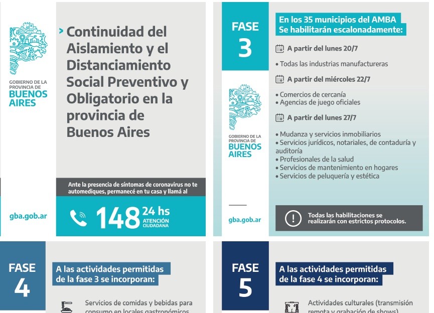 (La Plata, 17.Jul.2020 / A1 Noticias) En los 35 municipios que forman parte del área metropolitana (AMBA), se definió una “Fase 3 escalonada” del ASPO, caracterizada por la apertura y habilitación de diferentes actividades y rubros en forma paulatina: a partir del lunes 20 de julio se pondrán en marcha todas las industrias manufactureras; en tanto que desde el miércoles 22 del corriente podrán reabrir comercios de cercanía y agencias de juego oficiales.