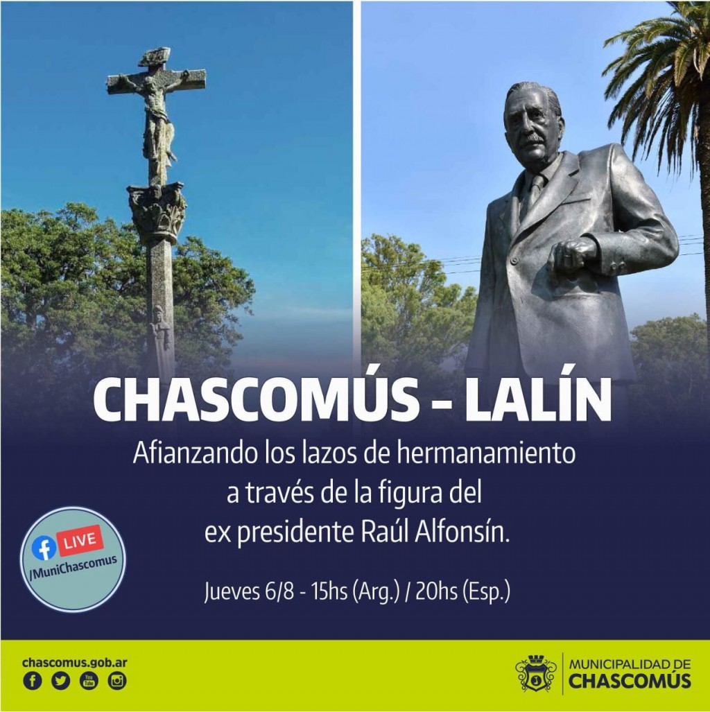 Esta actividad será transmitida en vivo por la página de Facebook de la Municipalidad de Chascomús, el 6 de agosto a las 15 horas (20 hs. de España) y contará con la participación del intendente Javier Gastón; el Presidente del Centro Lalin Agolada y Silleda de Galicia en Buenos Aires José Luis Seoane; el Delegado de la Xunta de Galicia en Buenos Aires y Uruguay Alejandro López Dobarro, el Alcalde de Lalïn, José Crespo Iglesias y el Embajador Argentino en España Dr. Ricardo Alfonsín