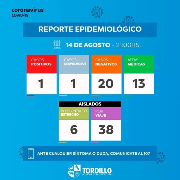 El intendente Héctor Olivera a través de la Secretaría de Salud del Municipio de Tordillo informa que se han detectado 0 (cero) nuevos casos positivos de COVID-19 y dado de alta médica a 13 (trece) casos. Por lo tanto, hasta el momento el Municipio de Tordillo reporta 1 (uno) casos positivos activos, 1 (uno) casos sospechosos y 44 (cuarenta y cuatro) personas en situación de aislamiento preventivo