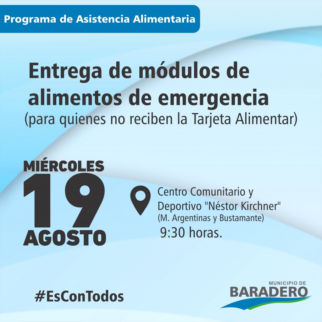 El Municipio de Baradero, a través de la Secretaría de Desarrollo Humano, informa que en el marco del Programa de Asistencia Alimentaria en contexto de emergencia sanitaria estará realizando entrega módulos de alimentos el miércoles 19 de agosto de 9:30 a 12:00 horas en el Centro Cultural y Deportivo “Néstor Kirchner” (Bustamante y Malvinas Argentinas)