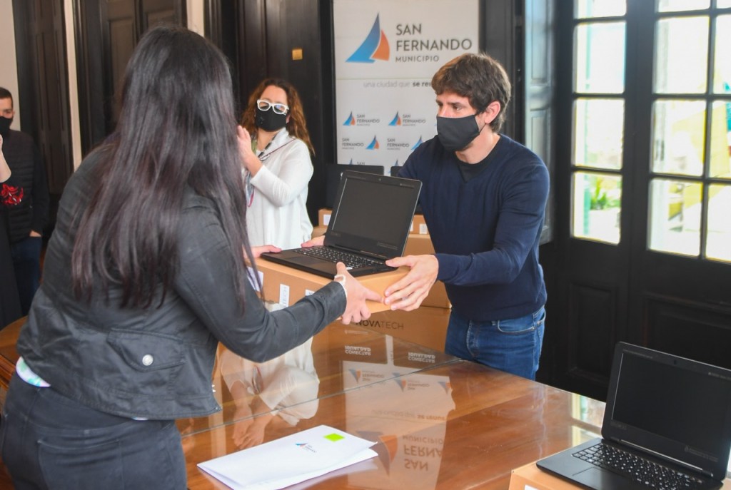 (San Fernando, 25.Ago.2020 / A1 Noticias) El Intendente de San Fernando Juan Andreotti entregó las primeras cuatro netbooks pertenecientes al programa ´Conectar Igualdad´ a estudiantes de 4to año de la Escuela Secundaria Nº 10, que no cuentan con acceso al material tecnológico. Este programa llegará a 18 Escuelas Secundarias del distrito con una entrega total de 657 computadoras.