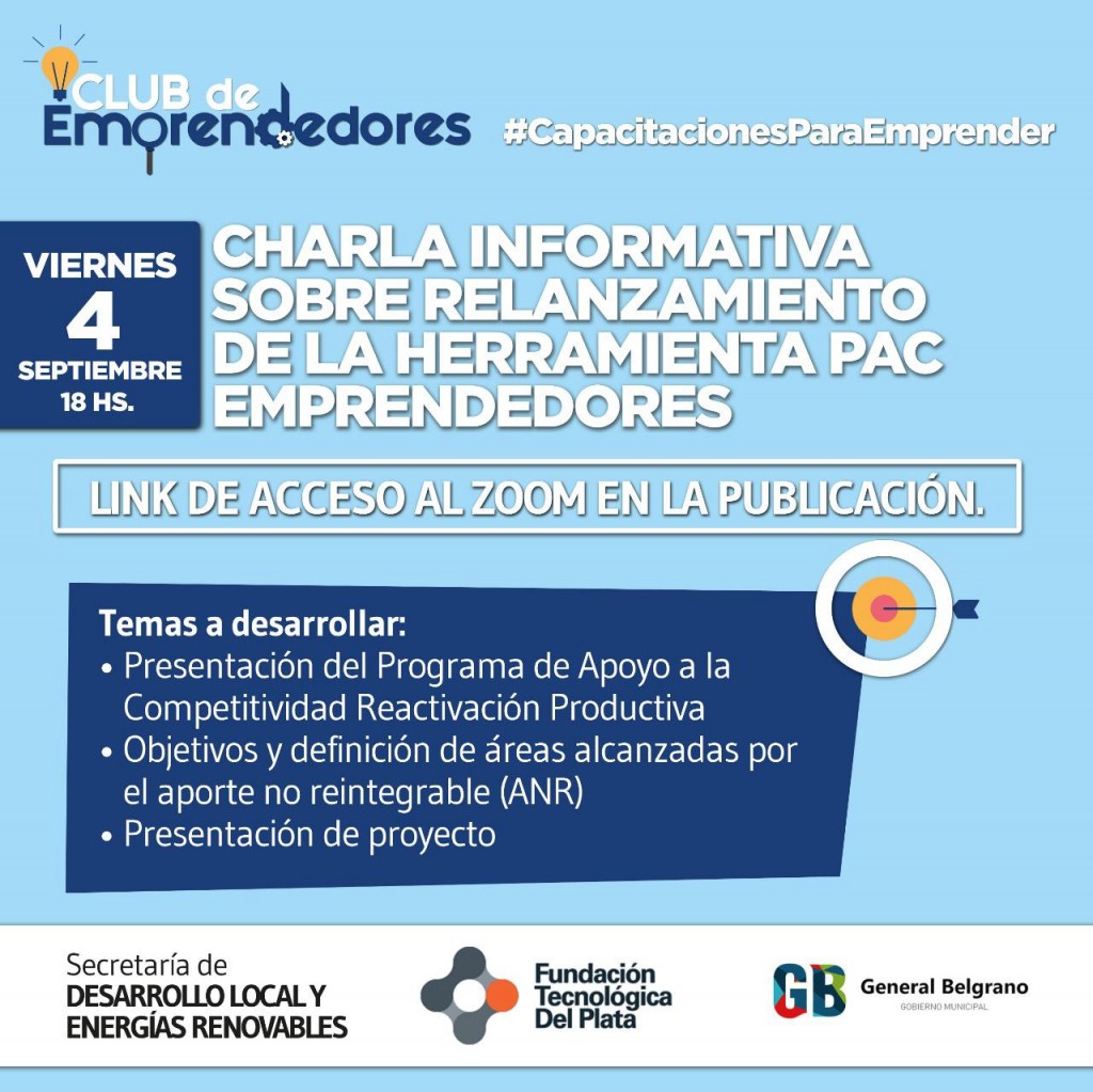 Mediante la misma se informará a emprendedores que puedan aplicar a dicho beneficio y se ayudará a dichos potenciales beneficiarios a presentar sus proyectos. La charla será llevada a cabo por integrantes de la Fundación Tecnológica Del Plata y para acceder hay que ingresar a https://us02web.zoom.us/j/88350529051