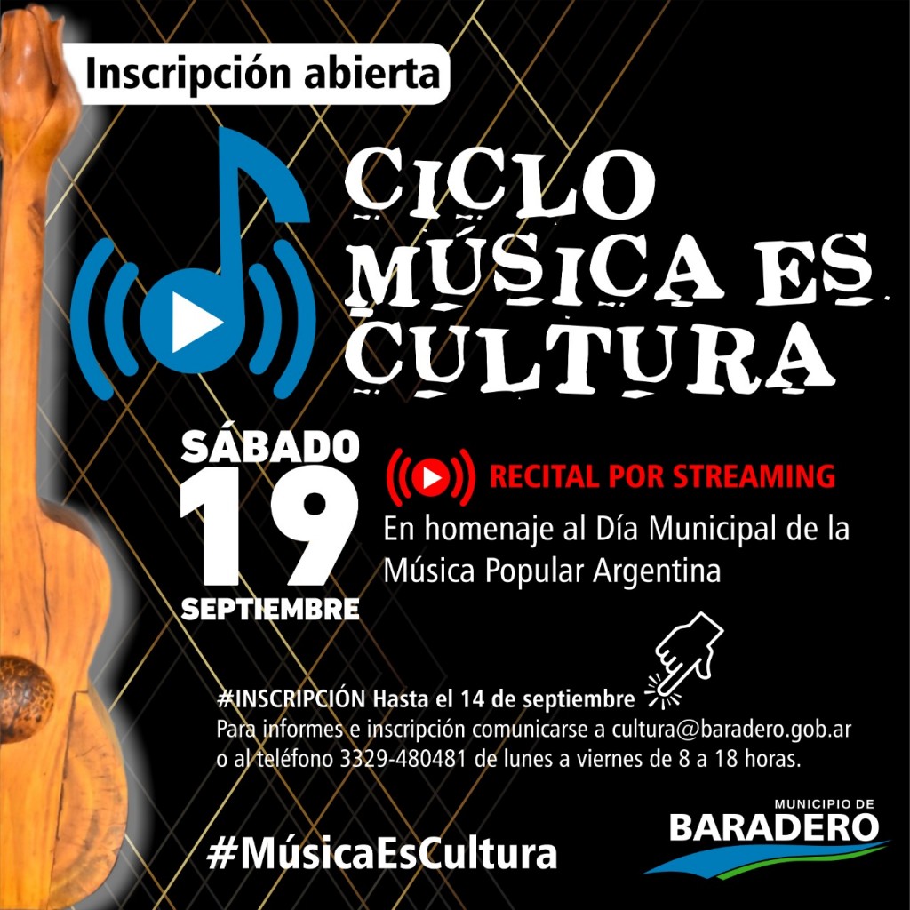 El Municipio de Baradero a través de la Dirección de Cultura dependiente de la Secretaría de Cultura, Turismo, Educación y Deportes convoca a músicos solistas y bandas locales a formar parte de la primera edición del ciclo online de “Música es Cultura” un recital que se transmitirá por streaming, enmarcado en la relevancia que tiene el Festival Nacional de Música Popular Argentina Baradero