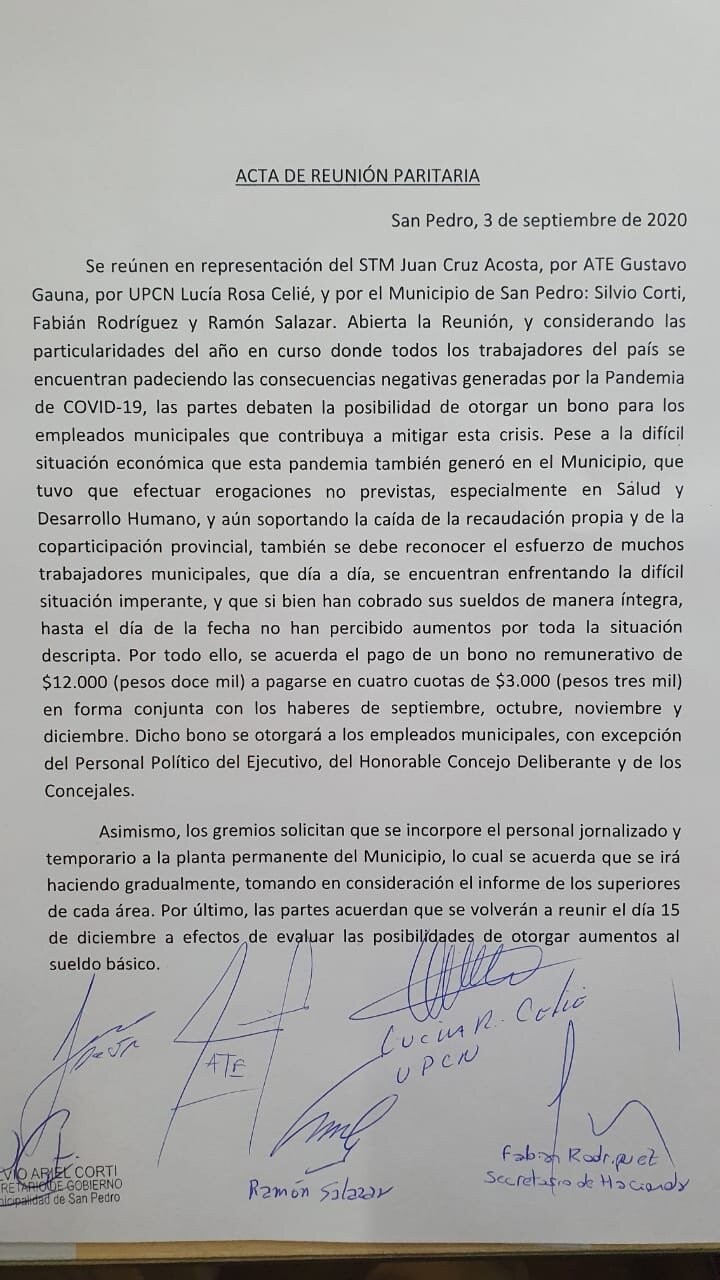 Con la participación de los representantes de los gremios municipales y funcionarios del gobierno local, se firmó esta tarde un acta de acuerdo que permitirá que los trabajadores cuenten con un bono no remunerativo de 12.000 pesos, abonado en cuatro cuotas consecutivas a partir de este mes